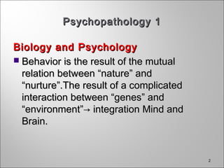 The document discusses the interplay between biological and psychological factors in the manifestation of psychopathology, emphasizing the importance of early attachment experiences in shaping internal psychological models and later relationships. It outlines two primary types of psychopathology: neurotic pathology related to conflicting mental representations and personality disorders associated with failures in mentalization. The content also differentiates between various personality disorders, illustrating how attachment styles and internalization processes impact psychological health and relationship dynamics.