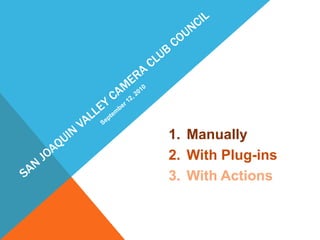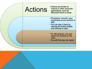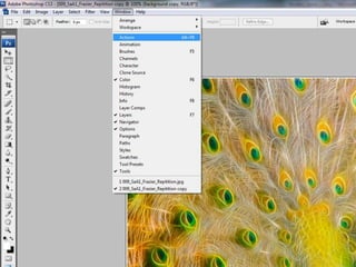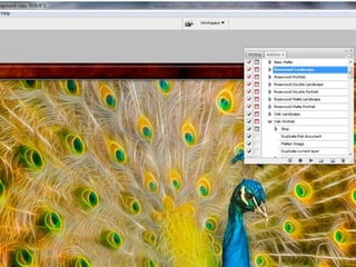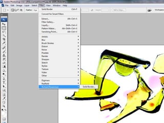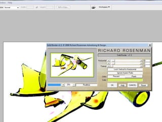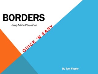 This document provides instructions for adding borders to images in Photoshop in 3 different ways: manually by selecting and modifying the image canvas, using plugins like "Solid Border" that automate the process, and through actions that can be recorded and reused. It outlines the manual steps to add inside and outside borders, potential issues like borders being too close to the image edge, and alternatives like changing the hue or using the stroke command. The document recommends exploring the hundreds of border plugins available and notes that many free actions can be found online to quickly add borders.