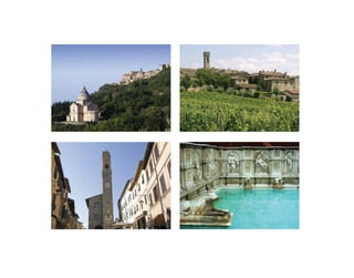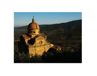 This document provides descriptions of several locations in Tuscany, Italy, including Borgo Syrah luxury villas and vineyard, Cortona, Florence, Siena/Montepulciano, Lake Trasimeno, Perugia, and Arezzo. It highlights the rich art, architecture, culture, landscapes, food and wine of each region and invites the reader to explore the history and beauty of Tuscany.