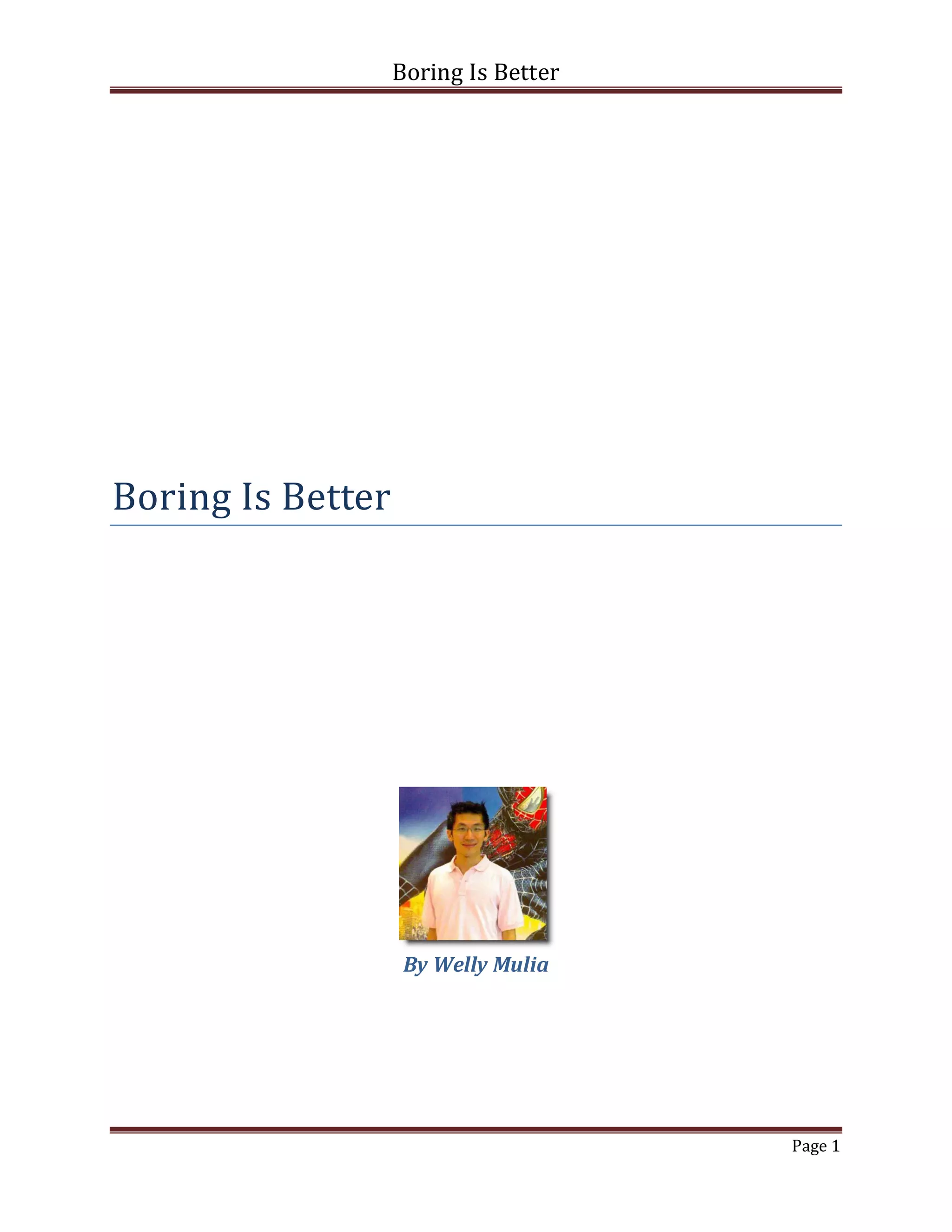 This document discusses why being boring and focusing on improving existing business metrics is better than constantly trying new ideas. It argues that tweaking existing businesses using real data on metrics like traffic, conversions, and retention allows incremental improvements, while starting from scratch with new ideas provides no real data. Entrepreneurs prefer exciting new ideas to boring routines, but are advised to focus on their long-term goals and financial freedom through consistent, boring improvements to existing businesses and metrics.