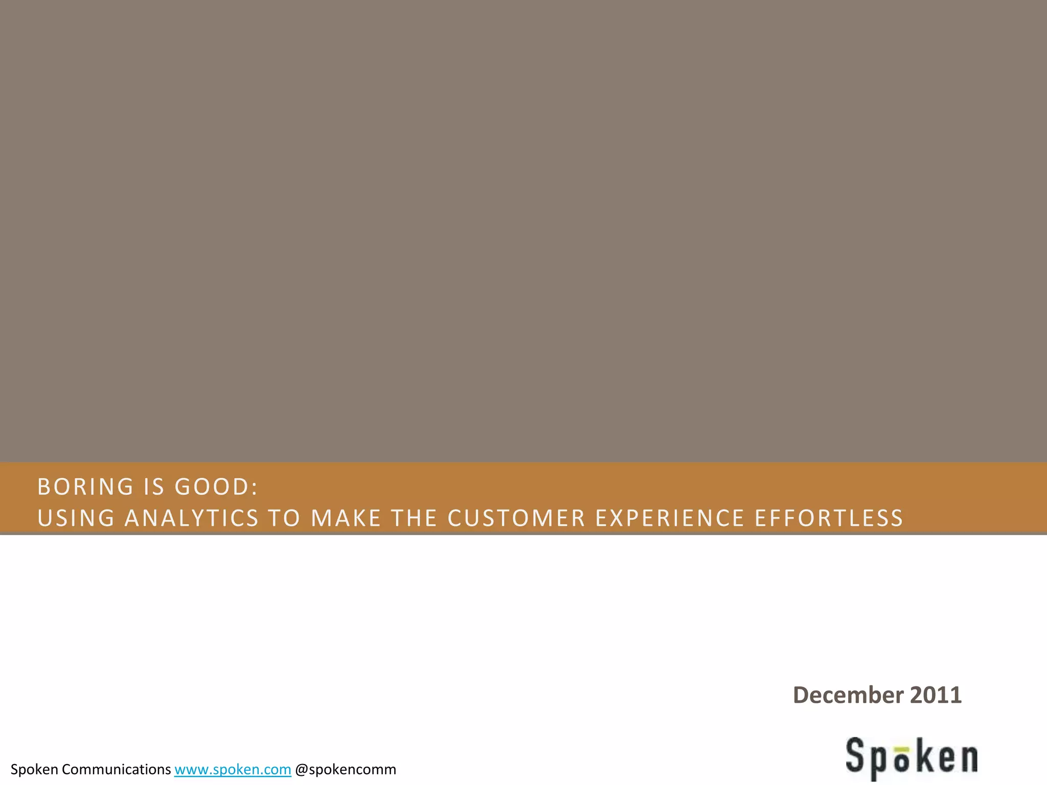 This document discusses how to use analytics to create an effortless customer experience. It argues that delighting customers does not build loyalty as much as reducing their effort. Metrics can inhibit the experience if they do not align with what customers want, which is getting their problem solved easily. The document recommends focusing on creating a consistent, boring process controlled by operations and measured with unified, actionable metrics. This includes enhancing automation with conversational IVR to collect data but have humans do problem solving and listening. Measuring the full agent interaction from end to end can provide a better view of customer experience.