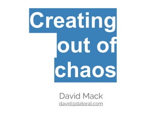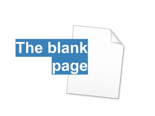David Mack provides tips for overcoming a blank page when writing or creating. He recommends bombarding yourself with examples from other works to spark ideas. Next, diverge by quickly drawing many ideas and converging to identify the best approaches. Finally, live-prototype ideas by testing them on other websites to get feedback before implementing. The document shares advice for generating new ideas and content by looking outward for inspiration when facing an empty page.
