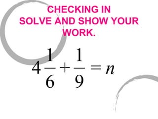 This document contains examples of subtracting fractions with borrowing. It provides step-by-step workings for subtracting fractions such as 1/6 - 5/6, 4/9 - 1/6, 7/6 - 2/3, 7/3 - 3/5, 5 - 2/7, and 6/18 - 1/3. The worked solutions simplify the fractions and show the subtraction process, resulting in equivalent fractions or whole numbers.