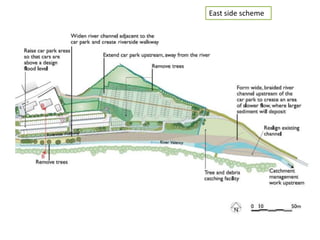 The document discusses flood prevention schemes for Boscastle, including an east side scheme, west side scheme, and catchment management. It looks at different approaches to flood prevention on the east and west sides of Boscastle and managing the overall catchment area to reduce flooding risks.