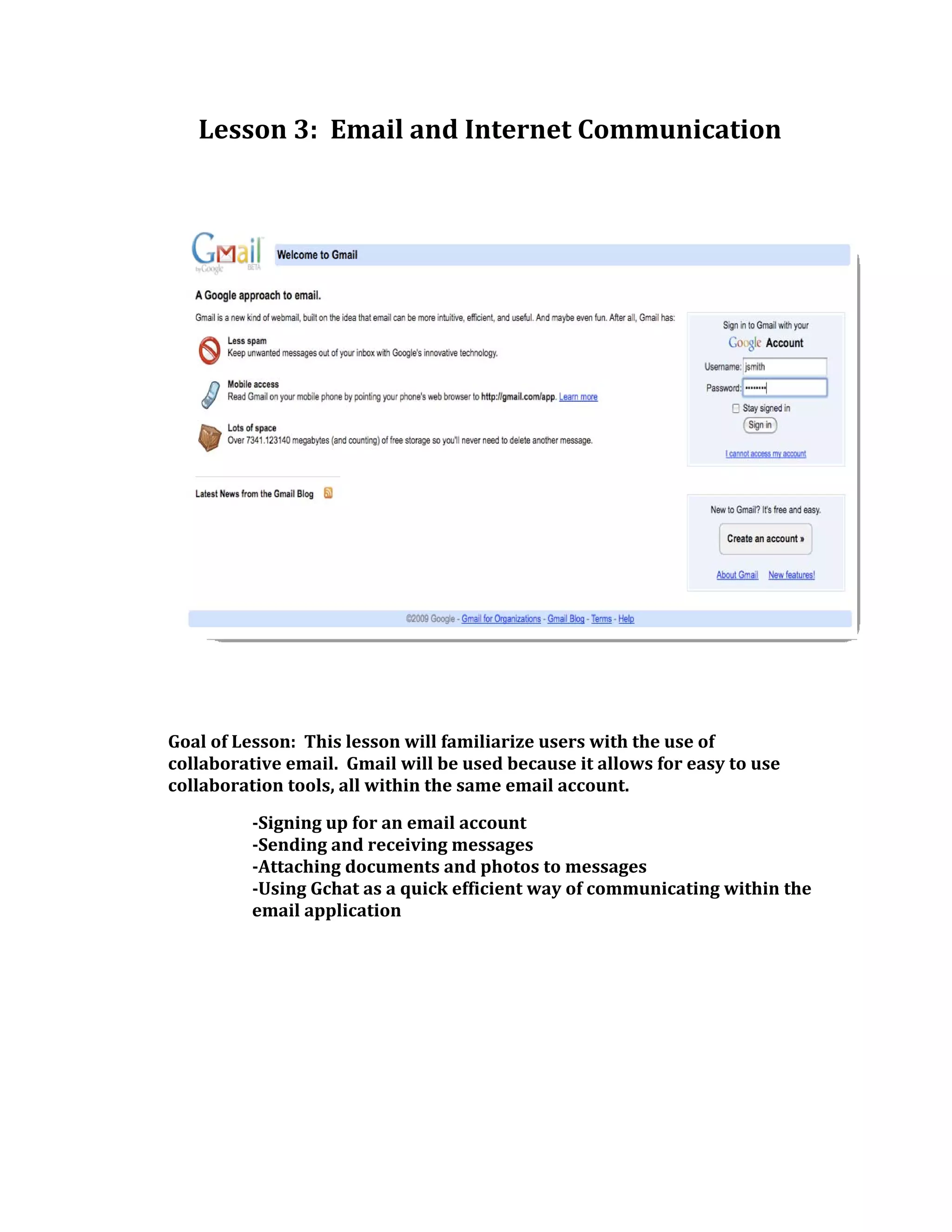 This lesson teaches users how to use Gmail for email communication and collaboration. It covers signing up for a Gmail account, sending and receiving emails, attaching documents to emails, forwarding emails, using the archive feature, and Gchat for instant messaging within Gmail. The goal is to familiarize users with Gmail's collaboration tools.