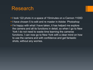 Jonathan Newton took 122 photos during a 15 minute period at Boscombe Pier to practice using his Canon 1100D camera. He selected 5 photos to edit in Photoshop to refine his camera skills before a trip to New York. The document describes his edits to 4 of the selected photos, including cropping to improve composition and using Photoshop tools to enhance focus and remove distractions. Newton was pleased with the results and felt more confident in his camera abilities for his upcoming trip.