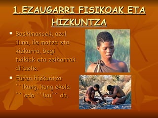 Boskimanoak 1. 2. 1.EZAUGARRI FISIKOAK ETA HIZKUNTZA Boskimanoek, azal iluna, ile motza eta kizkurra, begi txikiak eta zeiharrak dituzte. Euren hizkuntza ``!kung, kung ekola´´ edo ``!xu´´ da. 3. 2.NON BIZI DIRA Namibian, Angolan, Egoafrikako Errepublikan, Zambian eta Zim-babwen bizi dira. Klima idor eta beroa da. Temperatura oso altua da. 4. 3. BIZITZA Euren etxeak, konoren itxura dute. Lastoz eta bustinez eraikitzen dituzte. 5. 6. 7. 8. 9.