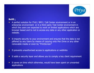 BoSS is a proprietary solution that restricts users on desktop computers to only specified browser-based applications and websites. It provides security for environments like call centers or test centers by preventing unauthorized access or copying of data. The BoSS solution involves installing a plug-and-play USB device that converts the desktop into a restricted browsing mode. It can be remotely managed and deployed at client sites without additional software licenses. The source code remains the proprietary property of Priya IT & HR Solutions.