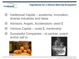 This presentation discusses what makes Boston's startup scene special, including its intellectual capital from top universities like MIT and Harvard, its venture capital funding, and successful companies. It notes the dense concentration of innovation in Boston's tech sector and life sciences industry, as well as the many resources that support startups like accelerators, investors, and entrepreneurial leaders. The conclusion is that Boston is a top ranked city for innovation.