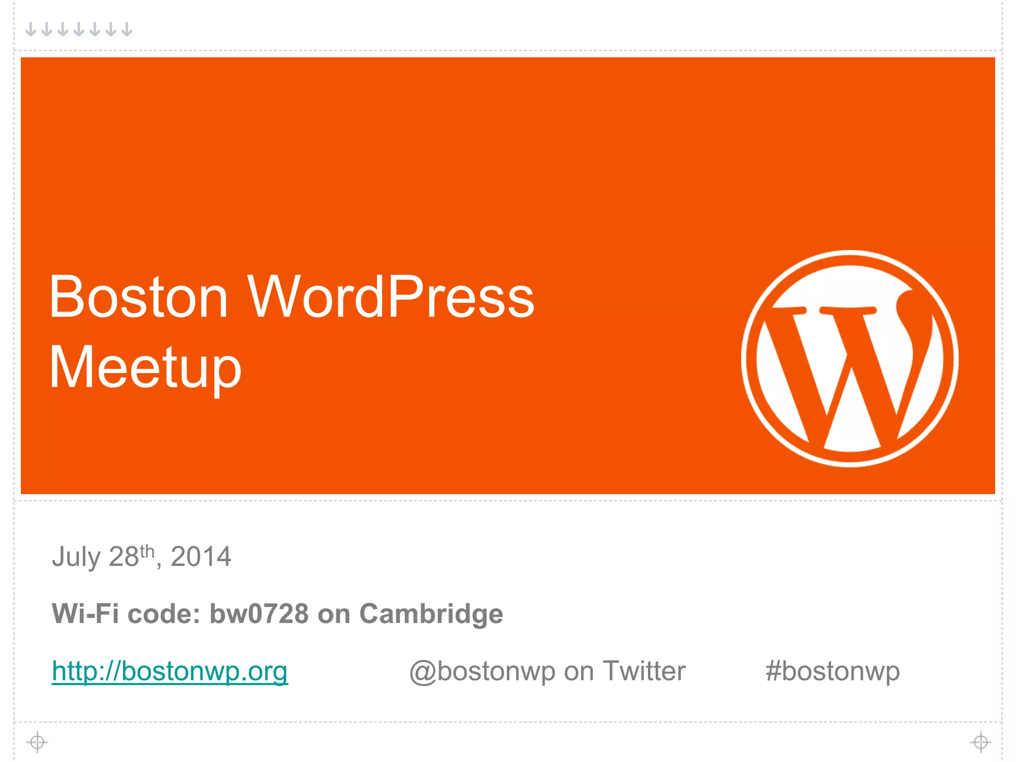 The document summarizes an upcoming Boston WordPress Meetup on July 28th, 2014. It provides details about sponsors and vendors attending, including Microsoft NERD, HostGator, and WP Engine. Information is also given about the meetup organizers, future meetups, WordCamp Boston in August, and other WordPress events in the region.