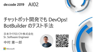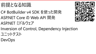 C# SDK チャットボットのユニットテスト • レベル400 ←上級者向け https://www.slideshare.net/KenichiroNakamura/devops-botbuilder