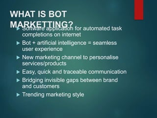 The document discusses bot marketing, a software application that automates tasks online and enhances user experience through AI. It outlines different types of bots, including chat bots and smart bots, and explores the benefits and drawbacks of using bots in marketing strategies. Key applications of bot marketing by companies like H&M and Disney highlight its effectiveness as a competitive business strategy.
