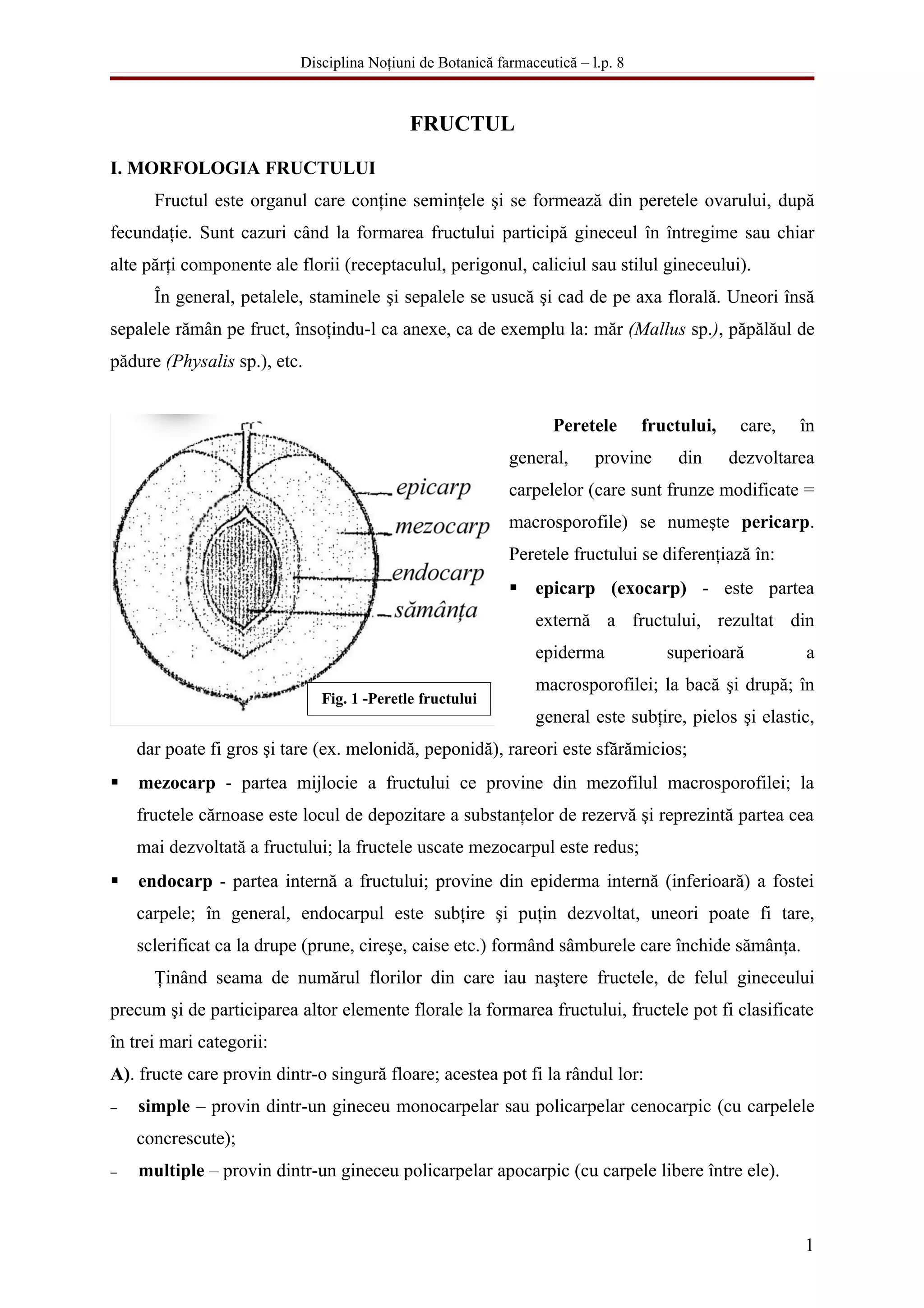 Documentul oferă o descriere detaliată a morfologiei fructului, care este organul ce conține semințele, și se formează din peretele ovarului după fecundație. Este prezentată clasificarea fructelor în funcție de originea lor (fructe simple, compuse și false) și de natura pericarpului (cărnos sau uscat), furmoită de subtipuri specifice cum ar fi drupa, bacă, cariopsa, și capsule. De asemenea, se discută despre tipurile de deschidere a fructelor la maturitate, inclusiv fructe dehiscente și indehiscente.