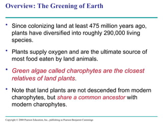 The document discusses the evolution and diversity of land plants, highlighting their adaptations for colonizing land over 475 million years ago. Key derived traits include alternation of generations, multicellular embryos, and specialized structures like sporangia and gametangia. The importance of vascular tissues for growth and ecological roles of plants, including mosses and the impact of seedless vascular plants, is also emphasized.