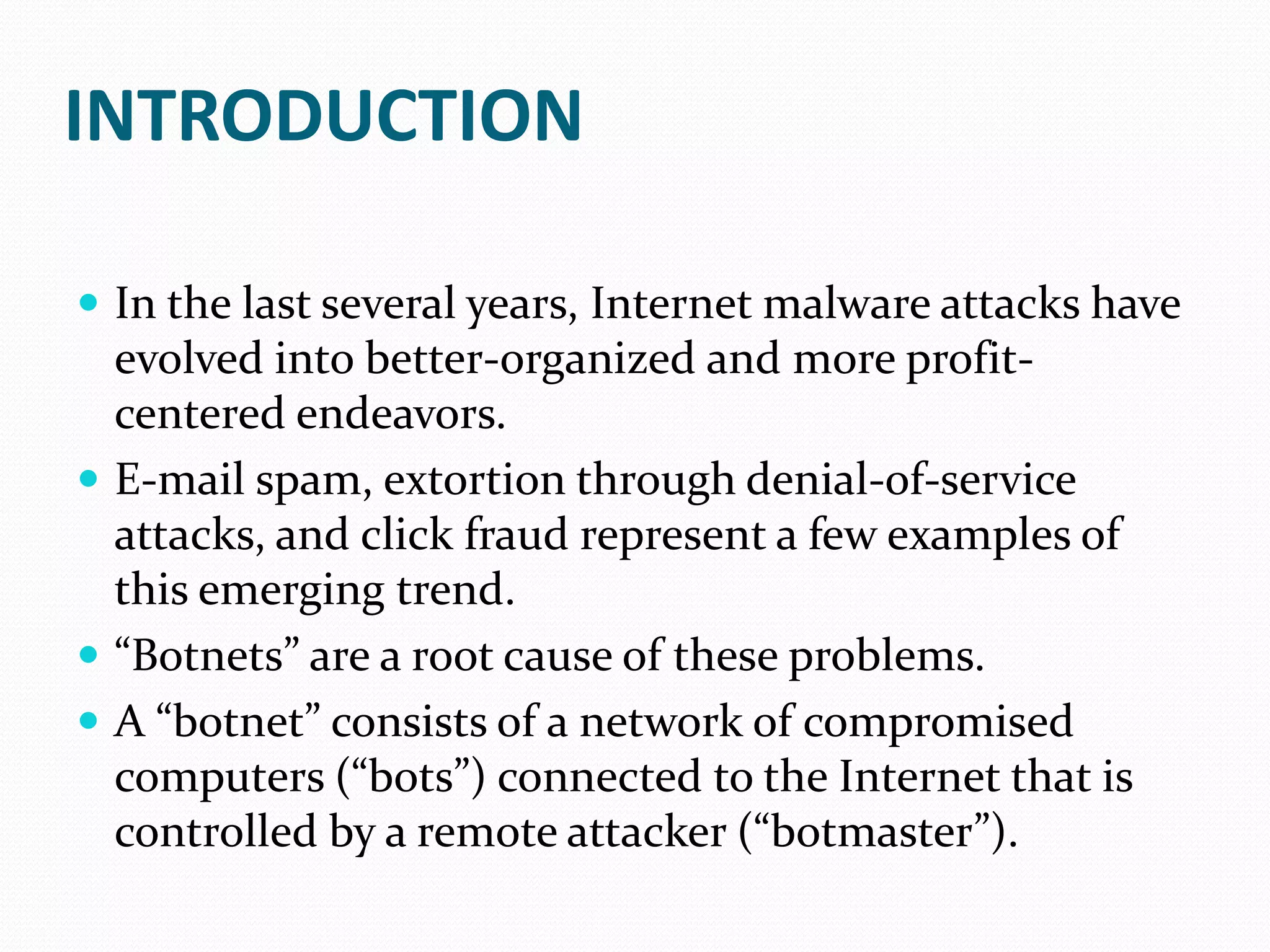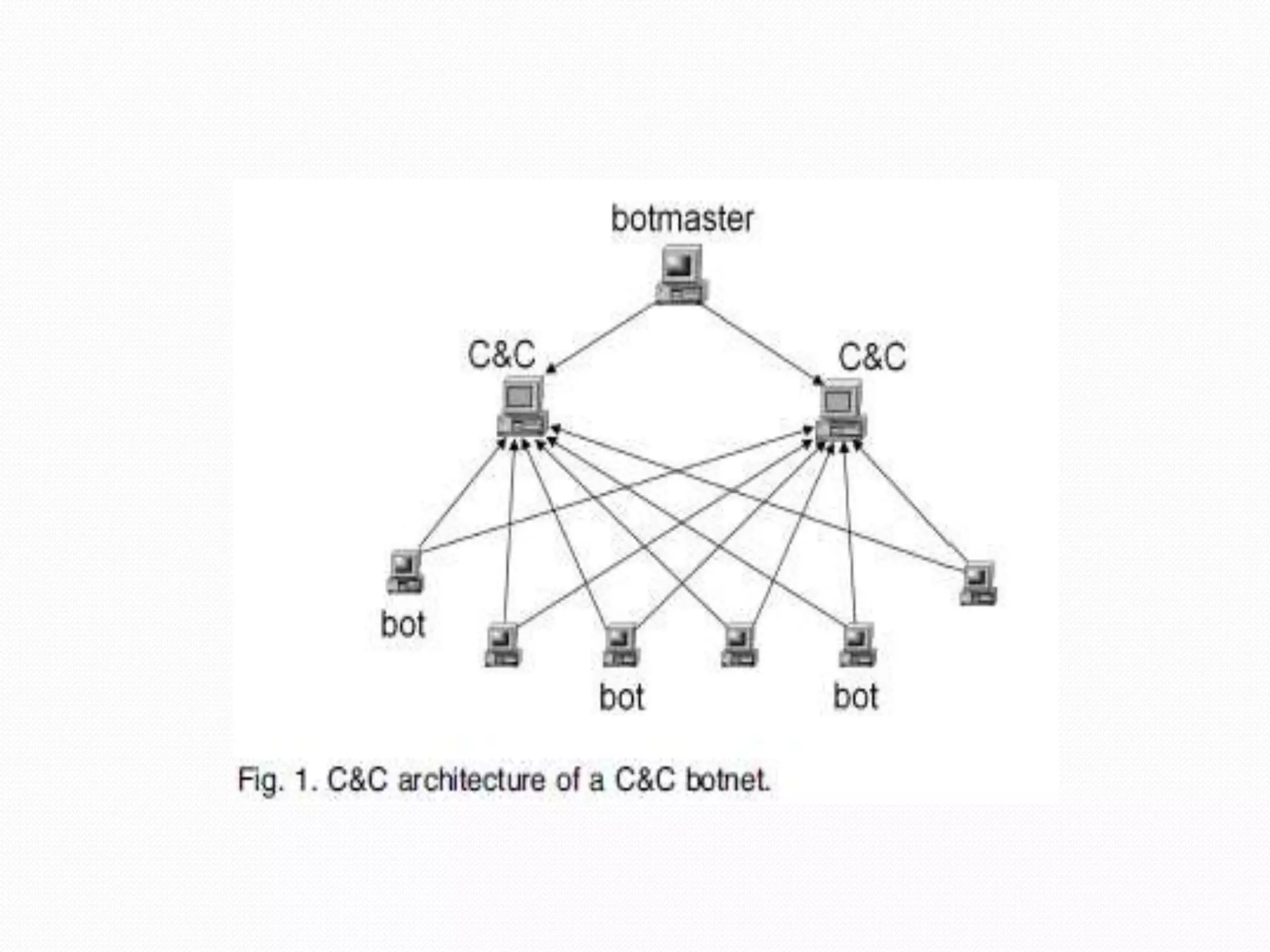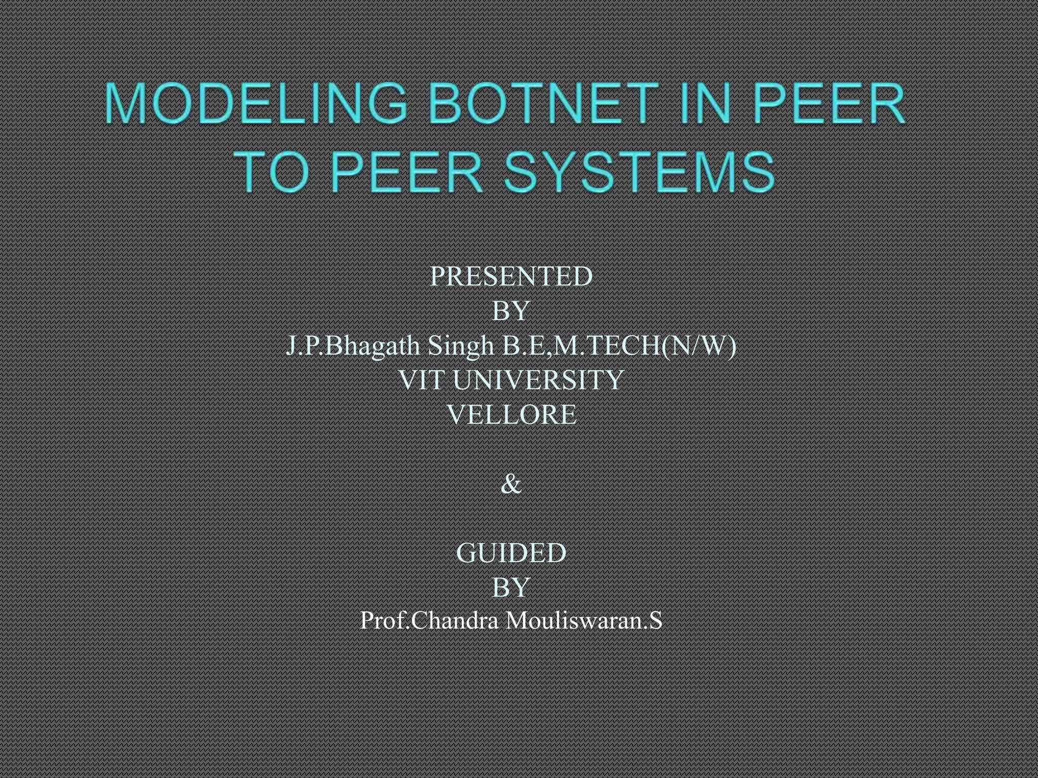 The document proposes a design for an advanced hybrid peer-to-peer botnet that is harder for defenders to detect and shut down. It describes existing centralized botnets that rely on command-and-control servers that can be shut down. The proposed design uses a hybrid peer-to-peer architecture with servent and client bots to distribute commands across the network in a decentralized way. It also describes how the botmaster can monitor the entire botnet by having bots report information directly. Defenders could use honeypots to detect and block the botnet, but it may still be difficult to monitor without exposing the honeypots.