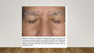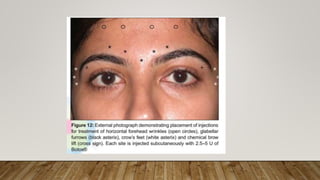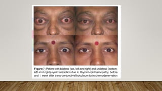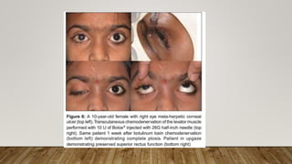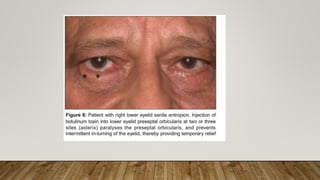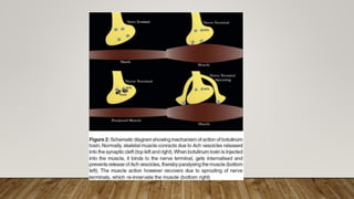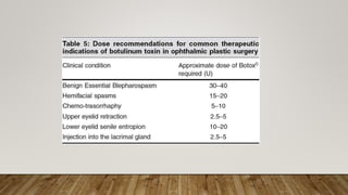 Botulinum toxin type A (Botox) is produced by Clostridium botulinum and effectively treats strabismus and other eye muscle disorders by temporarily paralyzing muscles. It works by inhibiting the release of acetylcholine at the neuromuscular junction, preventing nerve impulses from being transmitted to muscles. Common uses in ophthalmology include treating blepharospasm, hemifacial spasm, dry eye, and strabismus, with the effects lasting 2-4 months before the muscle function returns.