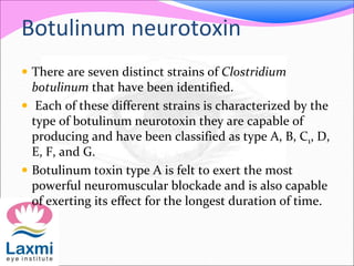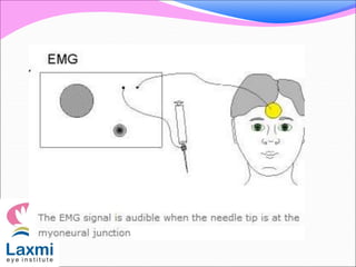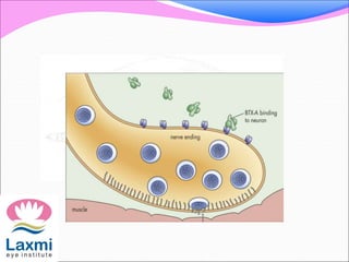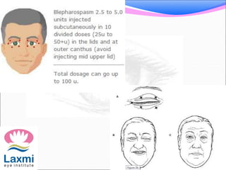 Clinical applications  Eyelid: Facial dystonia-blepharospasm  Hemifacial spasm  Reduce lid retraction- thyroid eye disease  Apraxia of lid opening  Induce ptosis in exposure keratopathy  Lower lid spastic entropion