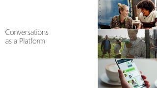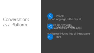 The document discusses Microsoft's bot building capabilities using ASP.NET Web API and various intelligent tools, highlighting the bot framework's features for developing conversational and business logic applications. It emphasizes the importance of adaptability, user context, and composable controls while presenting tools for natural language understanding, payment integration, and improved analytics. The document also provides resources for getting started with bot development and mentions upcoming features in language understanding and bot federation.