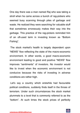 Raj saw rag-pickers searching through garbage for valuable items and was reminded of "bottom fishing" in investing. Bottom fishing refers to identifying undervalued stocks of healthy companies when negative macroeconomic conditions or news has driven down the entire stock market to bottom levels. Though risks are high in poor economies, bottom fishing allows astute investors to find stocks trading below their intrinsic value that can provide high returns when the market eventually recovers.