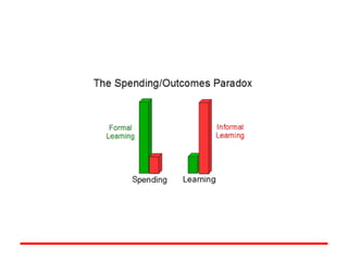 Informal learning can help organizations in several ways: it can increase sales and worker productivity by 20-30% by improving product knowledge; it can transform struggling organizations into very profitable ones; and it can generate new ideas to drive innovation. Fostering informal learning also reduces stress, absenteeism and healthcare costs for employees. Case studies show benefits such as unlocking worker potential, improving professional growth, boosting responsiveness and morale, and keeping up with technological changes. The document advocates for breakthrough performance through informal learning rather than just acceptable results.