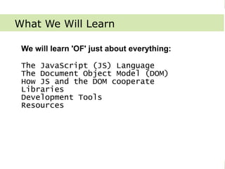 The document provides an overview of learning bottom up JavaScript, including the key things it will cover: the JavaScript language, Document Object Model (DOM), how JS and DOM cooperate, libraries, development tools, and resources. It describes the main aspects of JavaScript like being dynamic, weakly typed, prototype-based, and using first-class functions. It also explains the three main things done with JS: attaching event listeners, getting/modifying data, and updating the page.