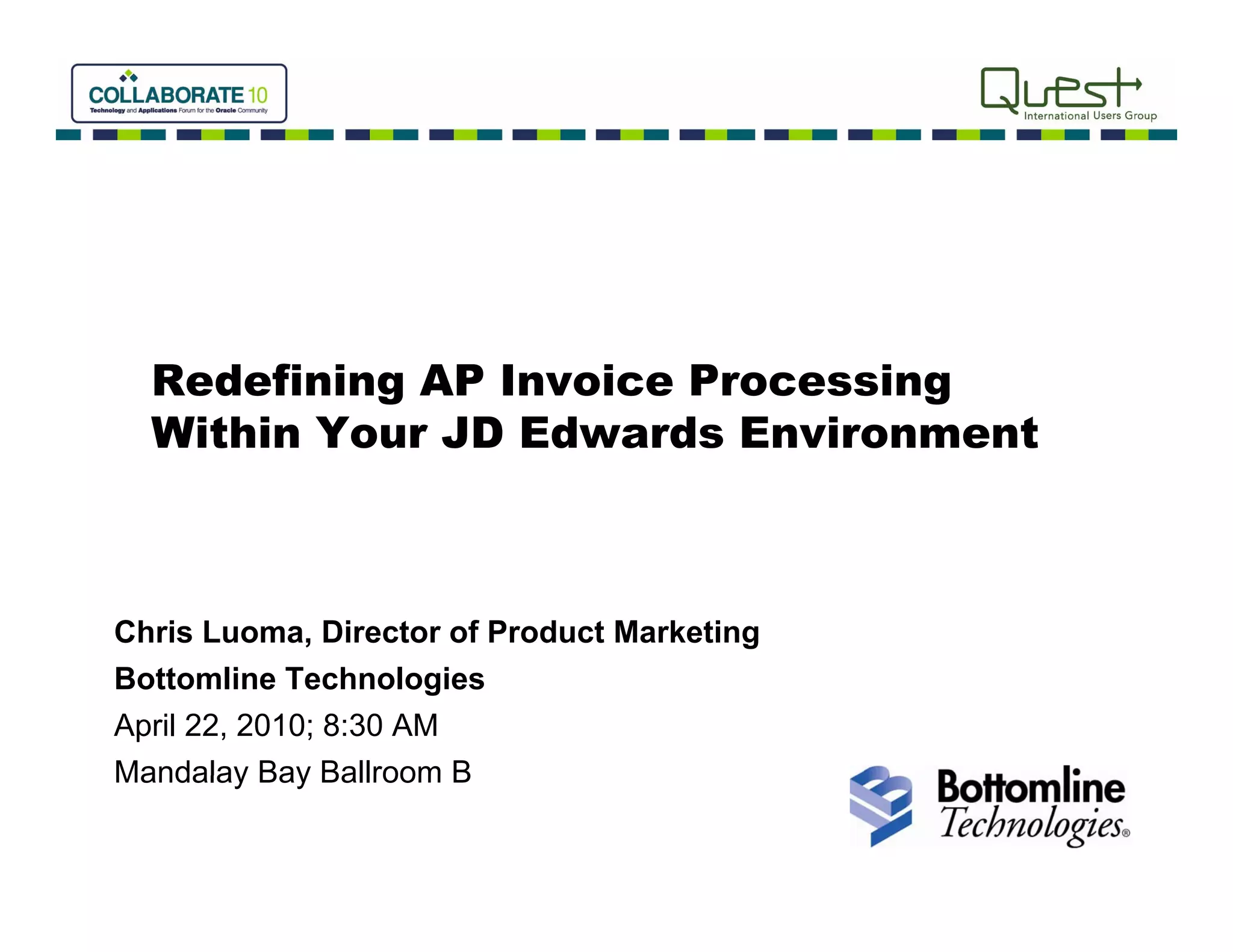 The document outlines the challenges in accounts payable (AP) invoice processing within JD Edwards environments and introduces Bottomline Technologies' TransformAP solution for integrated invoice management. It emphasizes the benefits of automation, such as reduced processing costs and cycle times, increased visibility, and improved supplier relations. Success stories from various companies illustrate how TransformAP has streamlined operations and enhanced productivity in AP departments.