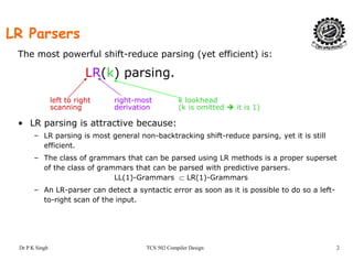 This document discusses LR parsers and the process of constructing SLR parsing tables. It begins by defining LR(0) items and the closure operation, which is used to find all LR(0) items that are reachable from a given set. The goto operation finds the set of LR(0) items for a given non-terminal. The canonical LR(0) collection is constructed by applying closure and goto until no new items can be added. This collection forms the basis for the SLR parsing tables, which are constructed by determining shift and reduce actions based on the LR(0) items in each state. The document provides examples of shift-reduce and reduce-reduce conflicts that can occur in SLR parsing tables.