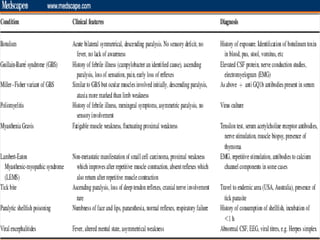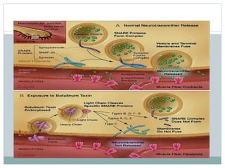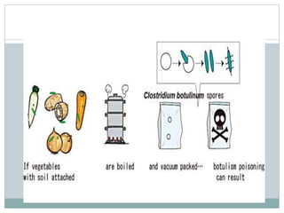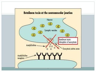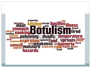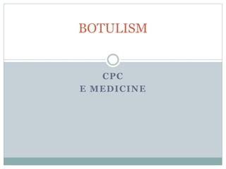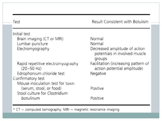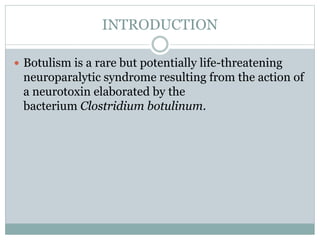 This document discusses botulism, a rare but potentially life-threatening illness caused by a toxin produced by the bacterium Clostridium botulinum. It enters the body through foodborne, wound, or infant exposure and causes descending muscle weakness. Symptoms include blurred vision, drooping eyelids, slurred speech, and paralysis. Proper diagnosis requires detecting the toxin in blood or stool samples. Treatment involves antitoxin administration and supportive care such as ventilation. With prompt treatment, mortality rates are low at 5-8%; respiratory failure is the main cause of death.