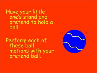 The document describes a presentation for preschoolers that teaches different ways to move an imaginary ball, including bouncing, tossing, spinning, and rolling it. For each motion, the children pretend to perform the action with their ball while chanting a short rhyme about "the way we [motion] the ball." The presentation is intended to engage preschoolers in learning different ball skills through interactive movements and repetition.