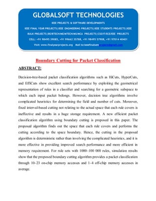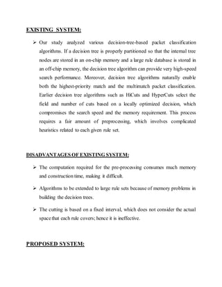 This document presents a new packet classification algorithm called boundary cutting, which improves upon traditional decision-tree algorithms by deterministically defining cuts based on rule boundaries instead of fixed intervals. The proposed algorithm enhances search performance and reduces memory requirements significantly, addressing the limitations of previous methods that relied on complicated heuristics and preprocessing. Simulation results indicate that the boundary cutting algorithm can effectively classify packets with fewer memory accesses compared to existing systems.
