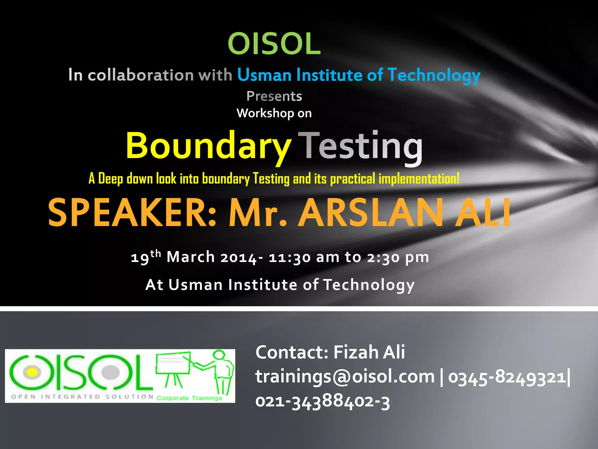 This document advertises a workshop on boundary testing techniques. The workshop will be held on March 19th from 11:30 am to 2:30 pm at the Usman Institute of Technology in OISOL. The workshop will introduce boundary value analysis, including the heuristics of "Galumphing," "Steeplechase," and "Leap and Creep." Attendees will learn how to perform boundary testing through practical exercises and write effective test reports. The workshop will be around 90 minutes for presentation and 2 hours of lab exercises to practice bug reporting in Excel. The instructor, Arslan Ali, has over 14 years of experience in IT, training, and quality assurance roles.