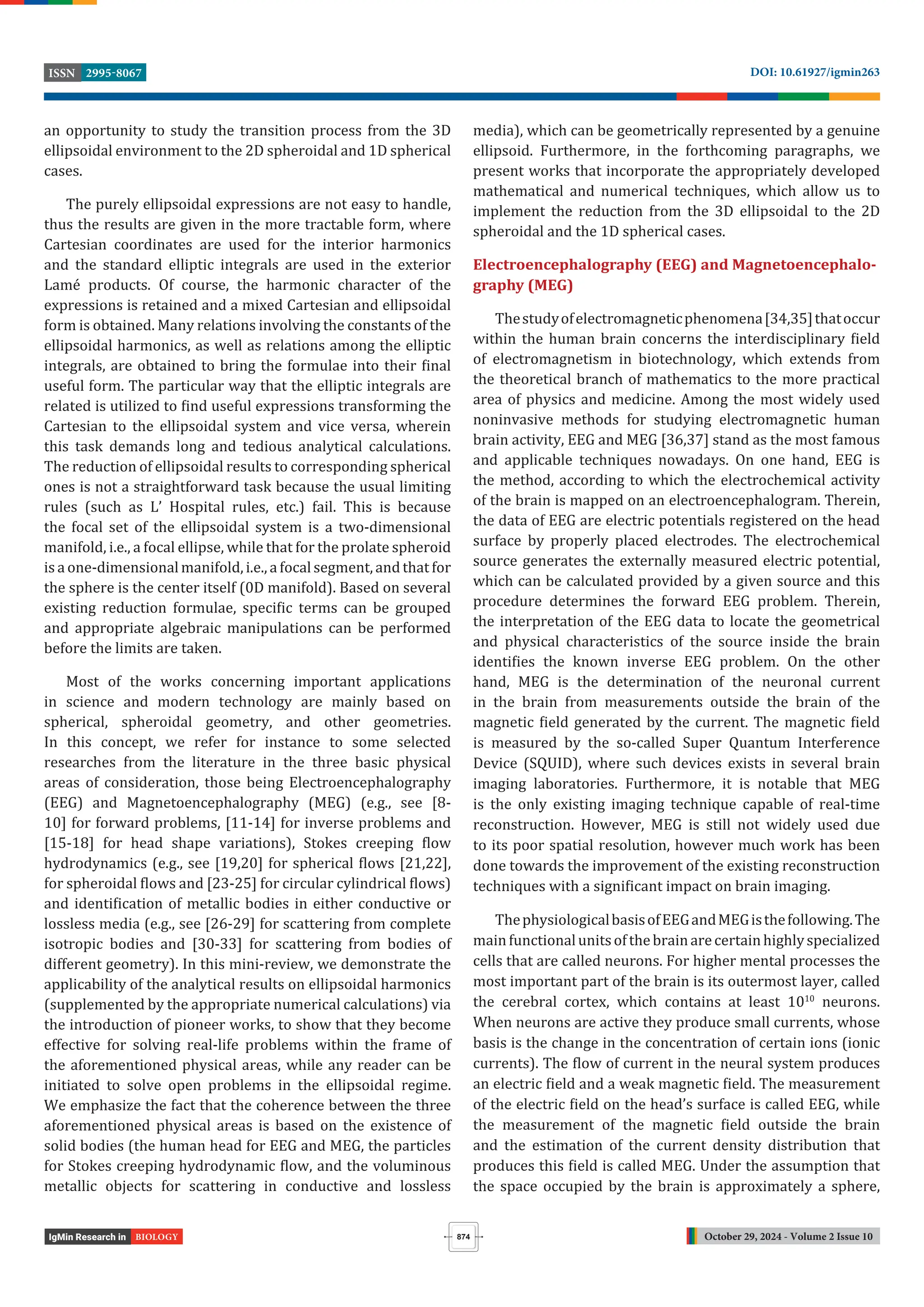 This document reviews the advancements in solving boundary value problems related to ellipsoidal geometry, focusing on applications in electroencephalography (EEG), magnetoencephalography (MEG), creeping hydrodynamics, and the identification of metallic bodies in conductive and lossless environments. It highlights the significance of ellipsoidal harmonics, detailing both theoretical and numerical approaches taken to address these complex problems, which have extensive relevance in various scientific disciplines. The review underscores the need for ongoing research to address remaining challenges and improve practical applications involving ellipsoidal geometries.