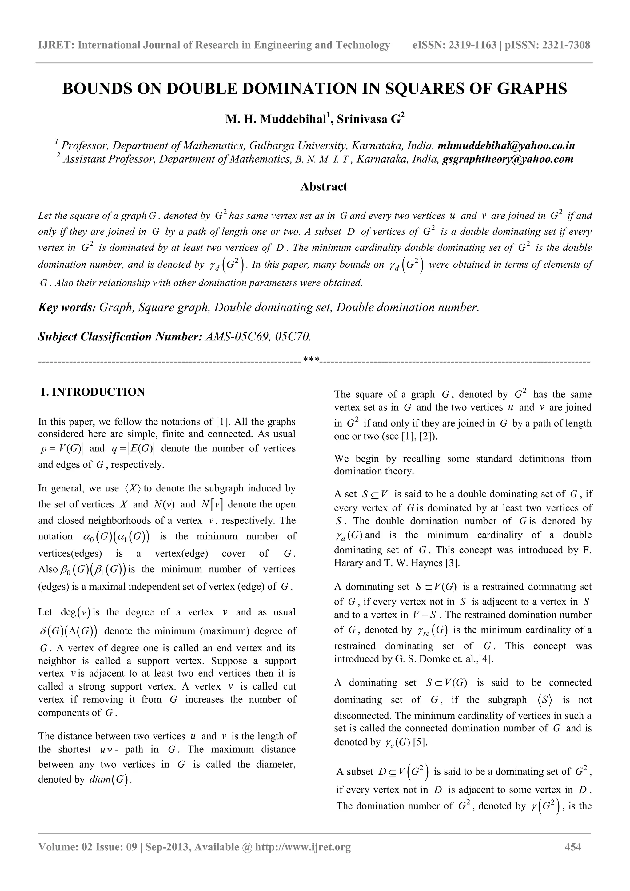 The paper introduces concepts related to double domination in the square of graphs, denoted as 2g, where a double dominating set ensures every vertex in 2g is dominated by at least two vertices from the set. Several bounds on the double domination number, γ2d(g), are established in relation to the original graph's parameters, alongside their connections to other domination metrics. The document includes various theorems delineating these relationships and bounds for specific types of graphs, such as cycles, complete graphs, and bipartite graphs.