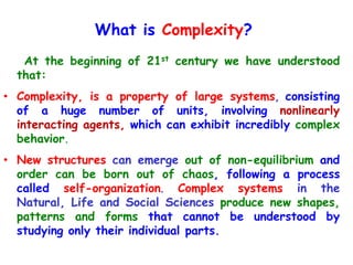 The document discusses the concept of complexity in large systems characterized by nonlinear interactions and emergent behaviors, emphasizing the role of mathematics in understanding these phenomena across various scientific fields. It highlights how fractal geometry and chaos theory can model complex structures like trees and population dynamics, and how self-organization leads to patterns in nature and society. The lecture concludes by advocating for the use of mathematical modeling as a tool to study and predict behaviors in complex physical, biological, and social systems.