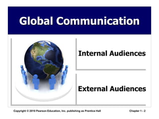 This document discusses effective business communication. It covers topics like understanding internal and external audiences, the benefits of communication, what employers expect, the communication process, communication skills, ethics, cultural awareness, feedback, business etiquette, and using technology. It emphasizes communicating clearly and respectfully with diverse groups, both within and outside the company, to solve problems, make decisions, and build relationships.