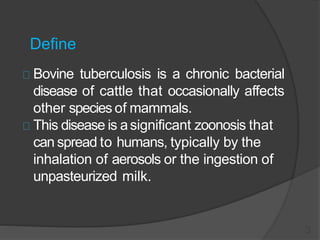 Bovine tuberculosis is a chronic bacterial disease of cattle caused by Mycobacterium bovis that can occasionally infect other mammals. It is a zoonotic disease that can be transmitted to humans through the inhalation of aerosols or ingestion of unpasteurized milk. The disease spreads between animals through close contact and shedding of bacteria in excretions or lesions, and from animals to humans occupationally through farming or slaughterhouse work. Clinical signs in animals include coughing, weight loss, and enlarged lymph nodes that can rupture and drain.