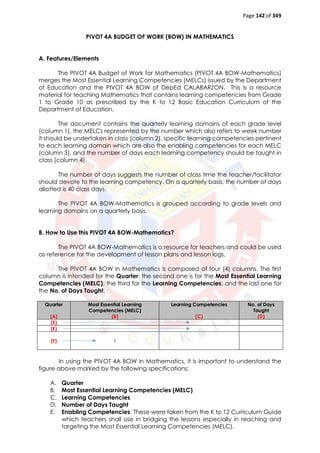 The document describes a Budget of Work (BOW) for teaching mathematics from Grade 1 to Grade 10. It merges the Most Essential Learning Competencies issued by the Department of Education with the BOW of DepEd CALABARZON. The BOW contains the quarterly learning domains, MELCs to be covered in each week, specific learning competencies for each MELC, and the number of days to devote to each competency. It is intended to be used as a reference for teachers in developing lesson plans and logs. The document provides an example of the BOW format and instructions for how teachers should use it.