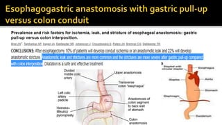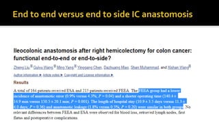 This document discusses intestinal anastomosis, which involves creating a connection between intestinal loops or ends. Intestinal anastomosis is commonly performed for elective and emergency cases involving conditions like cancer, infections, or obstructions. The key factors for a successful anastomosis are minimal contamination, good blood supply, and tension-free apposition of the intestinal ends. The document compares hand-sewn and stapled techniques, noting that while staplers are faster, studies have found no difference in outcomes between the two methods. Proper patient factors and surgical technique are more important than the specific method used.