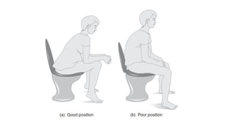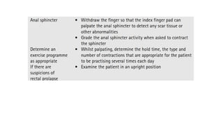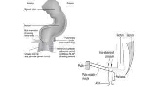 The document discusses bowel and anorectal dysfunction, outlining various conditions related to difficulty in defecation and factors contributing to constipation and anal incontinence. It details symptoms, diagnostic considerations, and treatment approaches, including diet, bowel retraining, and the use of biofeedback. Additionally, it highlights the importance of understanding the physiological mechanisms involved in bowel function and the impact of psychological and environmental factors on these disorders.