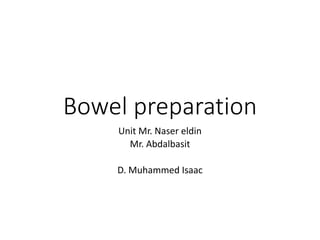 This document discusses bowel preparation prior to surgery to reduce risks. It describes two types of preparation: mechanical which involves diet changes and laxatives/enemas 1-4 days before surgery, or rapid preparation using whole gut irrigation via NG tube until clear fluids; and chemical which uses intestinal antiseptics like neomycin or metronidazole for 2 days or systemic antibiotics pre- and post-operatively like cephalosporins with metronidazole. The goal is to empty the large bowel and reduce bacterial flora to prevent anastomosis leakage and wound infection.