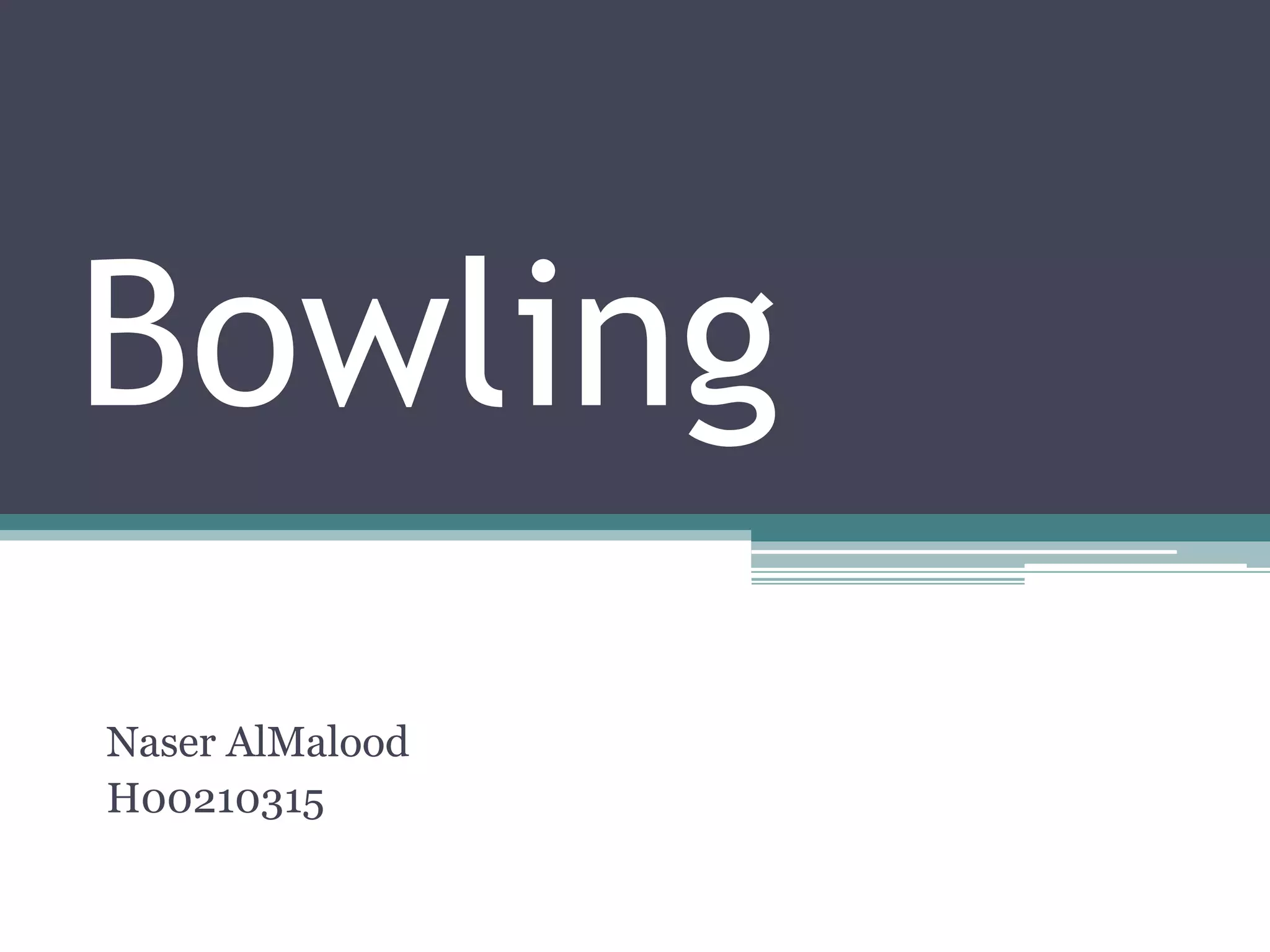 Bowling is a game that originated in England in the early 1900s. It involves rolling a heavy ball down a wooden lane to knock down 15 wooden pins arranged in a triangle formation at the end. Players take turns rolling balls down the lane to try and knock down all the pins on each roll. Points are scored based on the number of pins knocked down and the game is over once all frames have been completed.