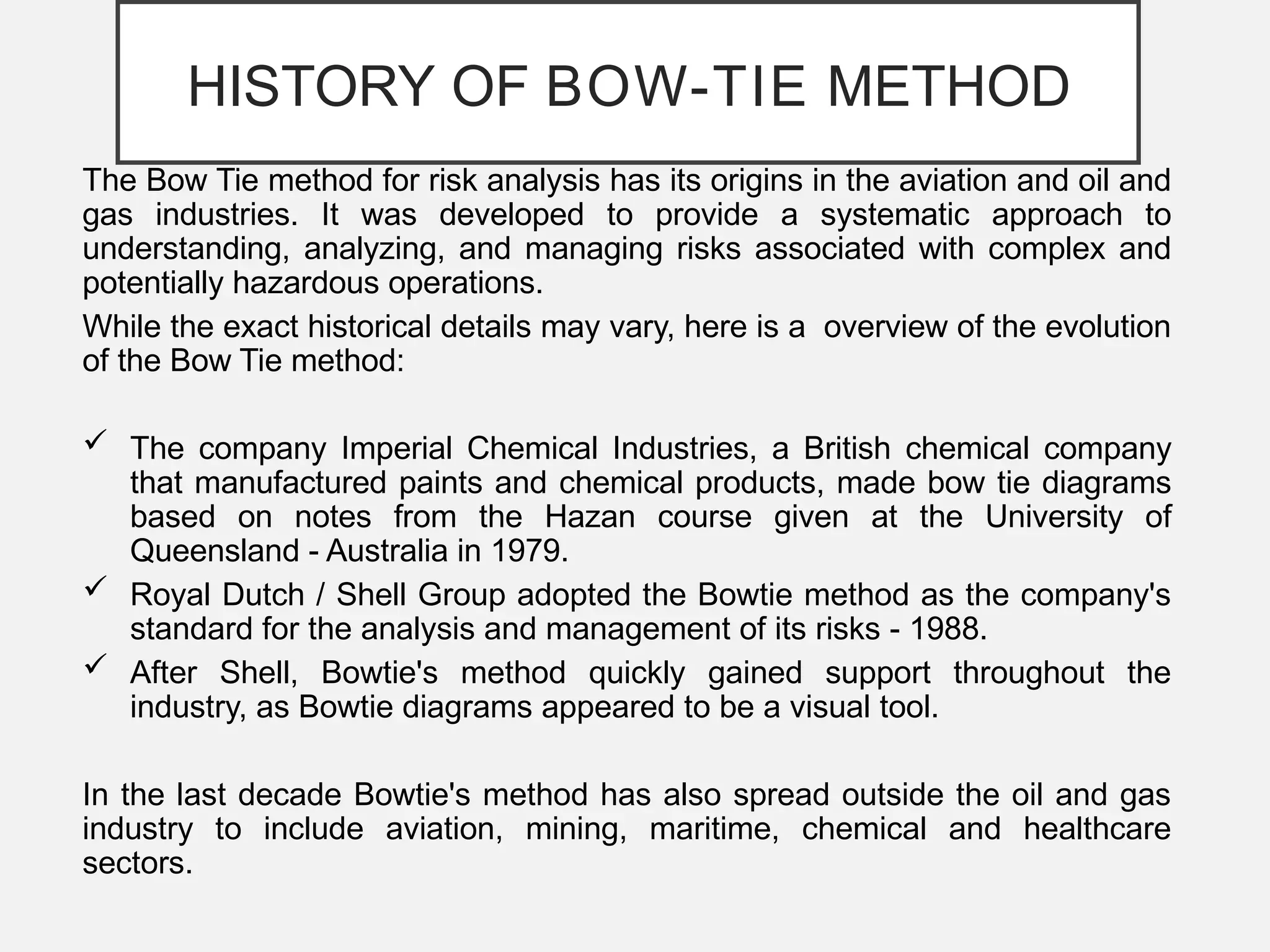 The bow-tie method for risk analysis originated in the aviation and oil and gas sectors to manage complex operational risks and was first developed by Imperial Chemical Industries in 1979. It has since become a standard tool, adopted by Royal Dutch/Shell Group and expanded to various industries, including healthcare and mining. The method establishes a clear link between risk controls and health, safety, and environmental management systems, enhancing understanding and management of risks.