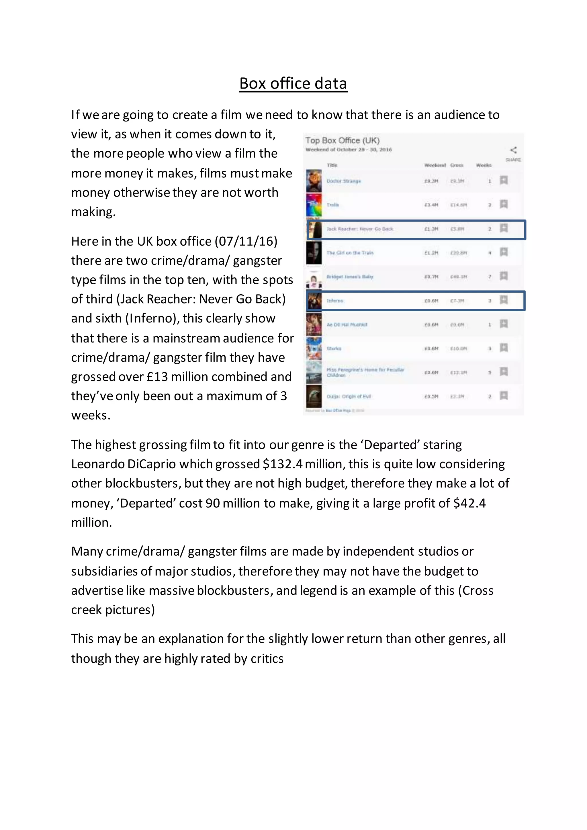 Films must make money to be worthwhile producing. Data from the UK box office shows that crime/drama/gangster films can attract mainstream audiences, as two examples have grossed over £13 million in their first three weeks. The highest grossing film in this genre is The Departed, which made $132.4 million on a $90 million budget, yielding a $42.4 million profit. These types of films tend to be made by independent or subsidiary studios with smaller advertising budgets than major blockbusters, which may explain their generally lower box office returns despite critical acclaim.
