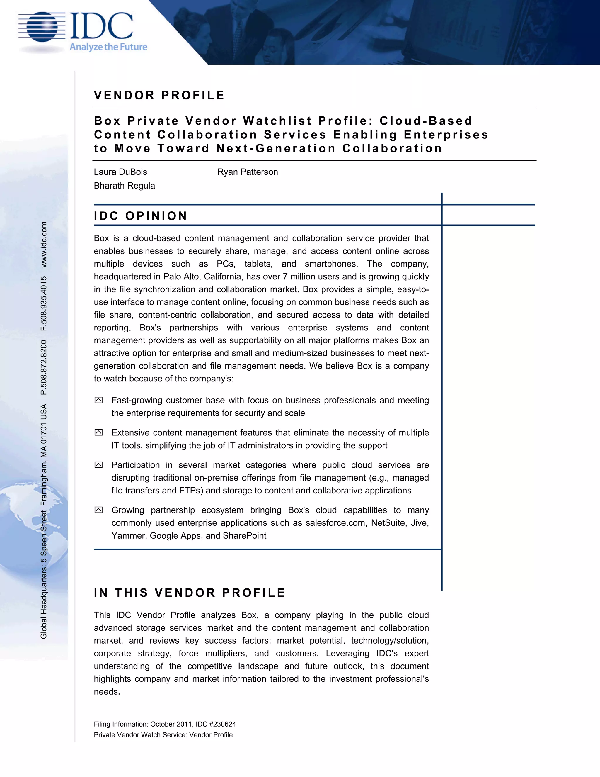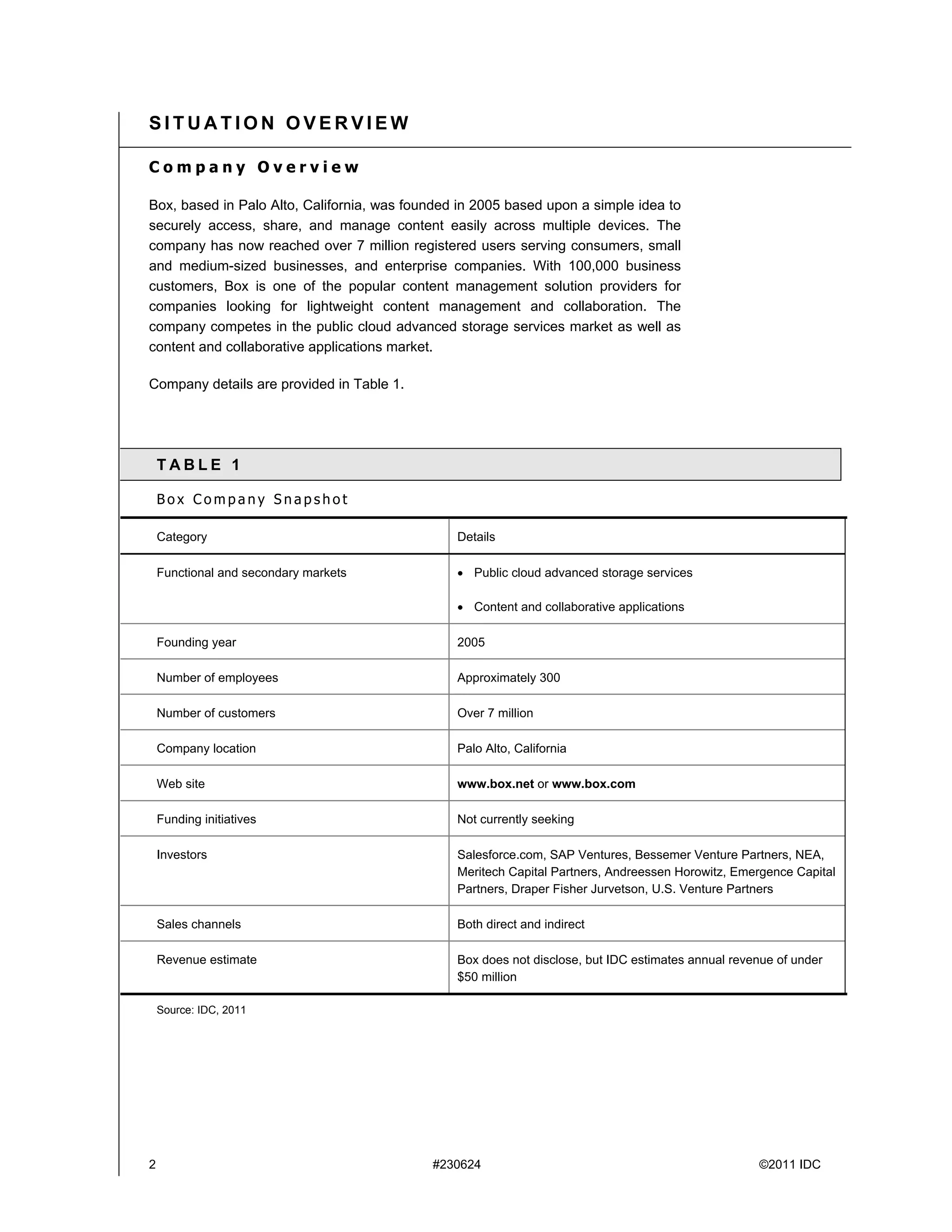 Box is a cloud-based content management and collaboration platform that allows secure sharing and management of content across devices, with a user base exceeding 7 million. The company offers extensive features for businesses, focusing on simplification of IT tools and collaboration needs, and has formed partnerships with various enterprise applications. With its rapid growth trajectory and a solid customer base, Box is positioned as a key player in the advanced storage services and collaboration markets.