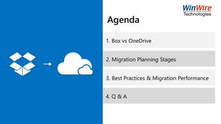 This document provides an overview of the key stages and best practices for migrating from Box to OneDrive. It discusses: