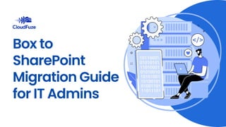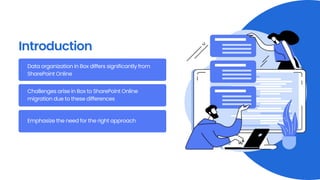 The document serves as a migration guide for IT admins transitioning data from Box to SharePoint Online, highlighting the different data organization structures and associated challenges. It outlines a step-by-step process using CloudFuze's migration platform, emphasizing features like permissions management and user mapping. Additionally, it discusses CloudFuze's advantages over competitors and provides instructions for migrating to various types of SharePoint sites.