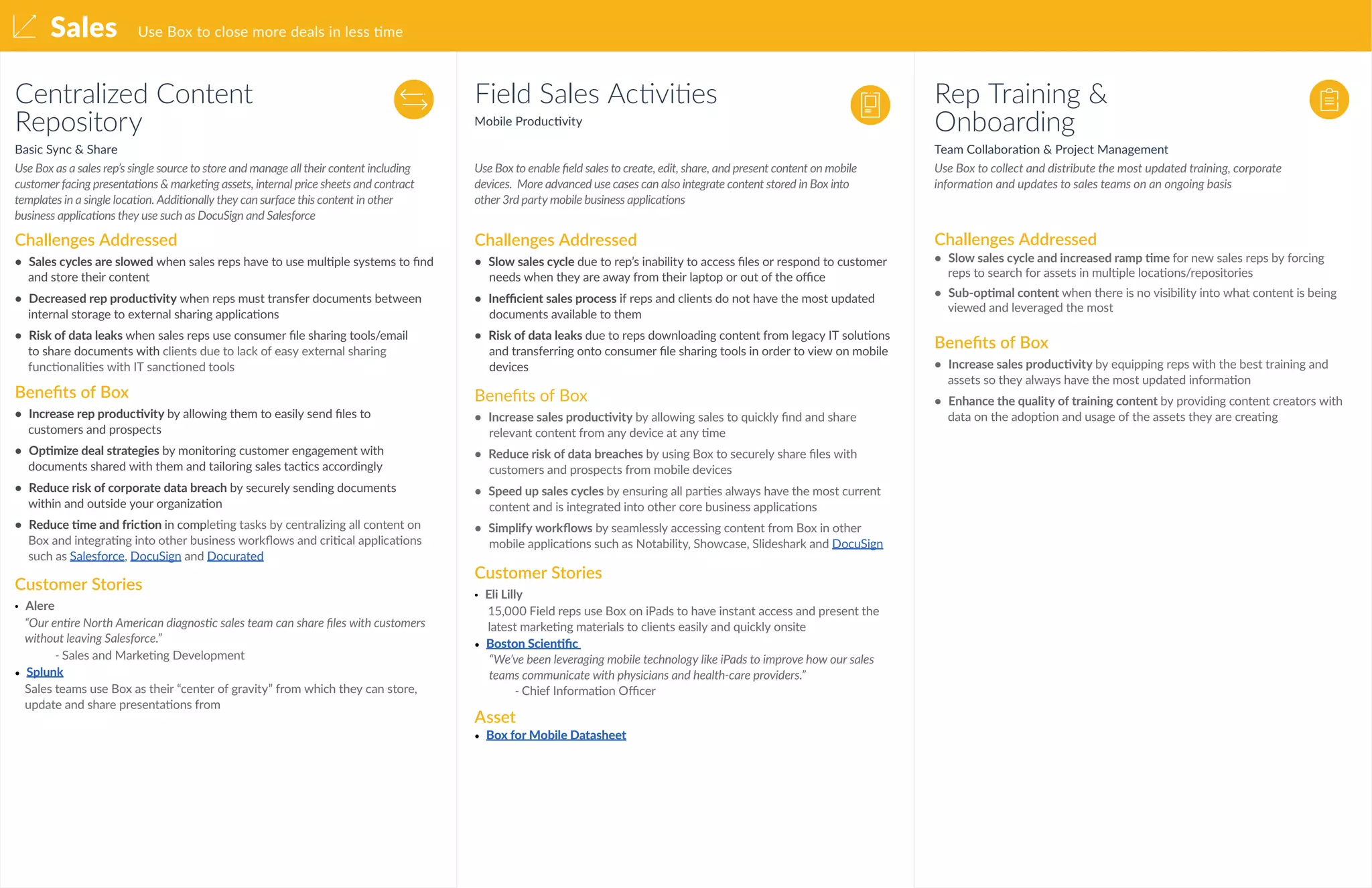 Box can be used by marketing teams as a centralized content repository for storing assets. It allows for efficient collaboration on event planning through shared access to files and folders. Mobile access enables viewing of event binders to reduce printing costs. Overall Box improves productivity, speeds processes, and reduces data leakage risks for marketers compared to legacy systems or consumer file sharing tools.