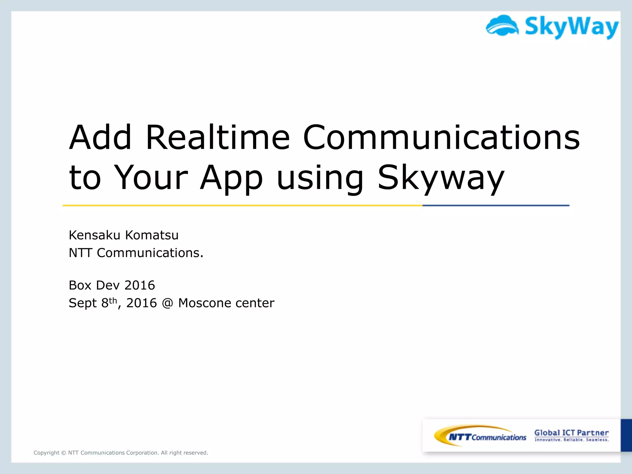 The document introduces the Skyway platform by NTT Communications, which facilitates real-time communications for applications. It highlights various concepts and solutions, including enterprise applications and an on-premise slide share solution, while emphasizing stability, security, and innovation. The presentation features technical details about the system architecture and advantages over generic web conferencing.