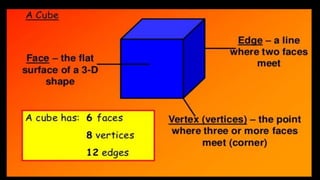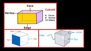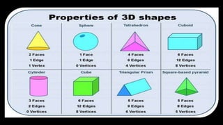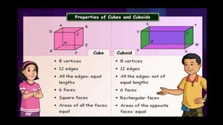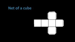 The document explains the dimensions of three-dimensional shapes, focusing on cubes and cuboids, and detailing their characteristics. It describes a net of a 3D shape as its flat representation that can be folded to form the shape, indicating that multiple nets can exist for a single 3D shape. Additionally, it provides an example of a net for a cube and a square-based pyramid.