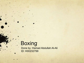 Boxing is a combat sport that involves two people throwing punches at each other while wearing gloves in a boxing ring. It has a long history dating back to 4000 BC in North Africa and was also popular in ancient Greece and Rome. The first documented boxing matches in Britain took place in the 17th century. Key rules for boxing were established in the 18th century. Some of the most famous boxers include Jack Johnson, the first African American heavyweight champion in the early 20th century, and Joe Louis who was known as the "Brown Bomber" and considered an American icon. Professional boxers can earn salaries ranging from a few hundred dollars for early fights up to millions of dollars per year or fight for top boxers like